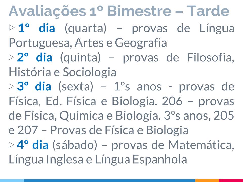 As provas do 1º bimestre acontecerão entre 15 e 18 de maio, conforme estabelecido e divulgado no início do ano (para visualizar, clique na aba calendário).